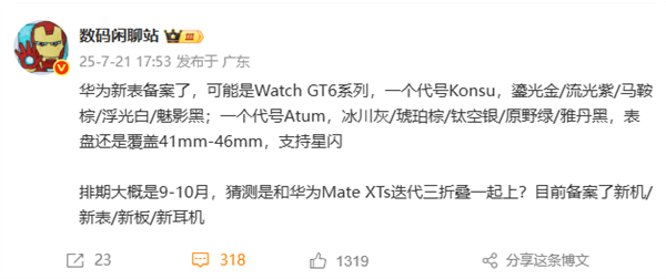 根据7月份 @数码闲聊站爆料,疑似华为WATCH GT 6系列的新品,代号为 Konsu 的版本提供鎏光金、流光紫、马鞍棕、浮光白、魅影黑配色;代号为 Atum 的版本提供冰川灰、琥珀棕、钛空银、原野绿、雅丹黑配色。