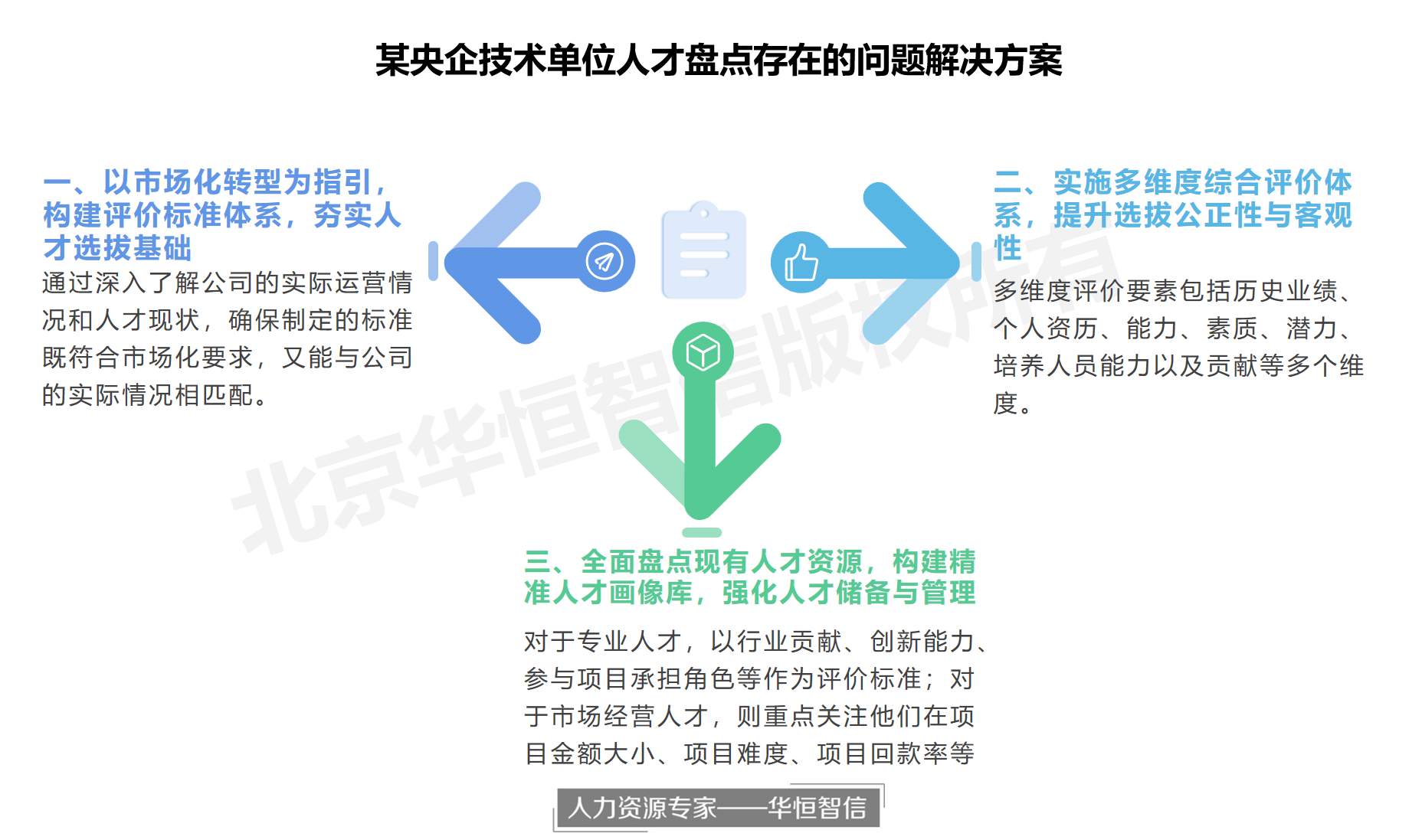 针对当前该公司人才选拔标准不明确、过于依赖基础条件进行筛选的问题,华恒智信提出了以市场化转型为导向,构建评价标准体系的解决方案。这一方案旨在为公司提供一套科学、系统的人才选拔依据,确保选拔出的人才能够符合市场化转型的需求。